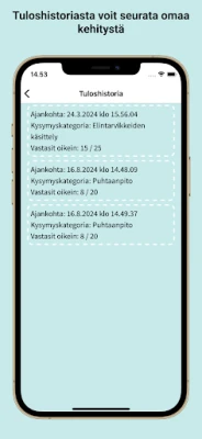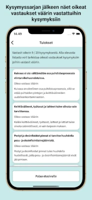 Hygieniavisan interaktiivinen harjoittelumalli tekee oppimisesta miellyttävää ja tehokasta. Jokaisen harjoituskierroksen jälkeen pääset tarkastelemaan vastauksiasi: näet, missä osuit oikeaan ja missä on vielä parannettavaa. Jokaisen väärän vastauksen yhteydessä saat perusteellisen selityksen, joka syventää ymmärrystäsi ja varmistaa, että opit virheistäsi. Näin varmistat, että olet valmis todelliseen kokeeseen.