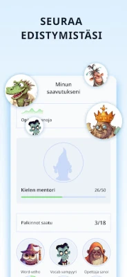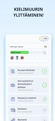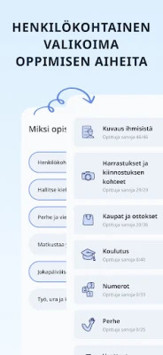 Sukella monipuoliseen aihealueiden valikoimaan, joka kattaa kaiken perhe-elämästä ja ystävistä aina matkustamiseen, ruoanlaittoon ja ammatteihin. Olipa kiinnostuksen kohteesi mikä tahansa, löydät varmasti teemoja, jotka pitävät oppimisen mielenkiintoisena ja ajankohtaisena. Päivittäiset, vain 5–20 minuutin mittaiset oppitunnit on suunniteltu sopimaan kiireiseenkin aikatauluun, ja säännöllisyys on avainasemassa kielen omaksumisessa. Harjoittele ääntämistä parantaaksesi sujuvuuttasi, tunnista sanoja visuaalisten korttien avulla, kehitä lukutaitoasi kuvien ja käännösten parissa, ja hio oikeinkirjoitustasi hauskojen kirjainpalapelien avulla.
