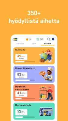 FunEasyLearnin ytimessä sykkii valtava sisältö, joka on huolellisesti rakennettu tukemaan edistymistäsi joka tasolla. Tutustu yli 6 000 ruotsin sanaan – yleisimmistä substantiiveista ja verbeistä adjektiiveihin – jotka on jaoteltu 7 eri vaikeustasoon ja yli 200 aiheeseen. Lisäksi käytössäsi on yli 5 000 arjen keskustelussa ja matkoilla tarvittavaa ruotsin lausetta, luokiteltuna 10 tasoon ja 120 aiheeseen. Kielitieteilijöiden ja opettajien kehittämä FunEasyLearnin menetelmä yhdistää ääntämissäännöt, tarpeellisen sanaston ja käytännön lauseet saumattomaksi kokonaisuudeksi. Opi visuaalisesti käsinpiirrettyjen kuvitusten avulla, vahvista ääntämystäsi ammattitason äänitallenteilla ja harjoittele kuuntelu-, kirjoitus- ja puhumispelien kautta, jotka syventävät ymmärrystäsi ja muistiasi.
