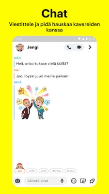 Snapchat muuttaa tavan, jolla koet ja jaat hetkiä. Se avautuu aina suoraan kameraan, jotta voit ikuistaa hetket spontaanisti ja vaivattomasti. Ilmaise itseäsi lukemattomilla tehosteilla, suodattimilla ja Bitmoji-hahmoilla, jotka tuovat persoonallisuutesi esiin. Sukella yhteisön luomiin, päivittäin päivittyviin luoviin kehyksiin, jotka tekevät jokaisesta Snapista ainutlaatuisen kokemuksen. Keskustele reaaliaikaisesti ystäviesi kanssa, jaa päiväsi kulku ryhmätarinoihin tai aloita yhteinen videopuhelu jopa kuudentoista kaverin kanssa – kaikki hauskoilla tehosteilla rikastettuna. Friendmojit puolestaan syventävät ystävyytenne ainutlaatuista sidettä luomalla teille kahdelle omistetut Bitmoji-hahmot.