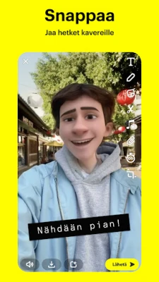 Snapchat tarjoaa nopean ja hauskan tavan jakaa hetkiä ystävien ja perheen kanssa. Ilmaise itseäsi luovasti uusilla linsseillä, suodattimilla ja AR-kokemuksilla. Tutustu myös yhteisön tarinoihin ja pysy ajan tasalla kavereidesi kanssa eloisassa ympäristössä.