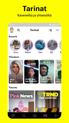 Snapchat ei ole vain pikaviestejä, vaan se on ikkuna maailmaan ja yhteisöön. Seuraa ystäviesi seikkailuja heidän tarinoistaan ja löydä kiinnostuksen kohteisiisi räätälöityä sisältöä laajemmasta Snapchat-yhteisöstä. Pysy ajan tasalla uusimmista uutisista ja uppoudu eksklusiivisiin alkuperäissarjoihin. Valokeila nostaa esiin parhaat ja inspiroivimmat Snäpit – voit itsekin jakaa omia luomuksiasi ja antaa niiden loistaa tai vain nauttia muiden nerokkuudesta. Valitse suosikkisi ja levitä iloa jakamalla ne eteenpäin. Tutustu ympäröivään maailmaan henkilökohtaisella Kartalla, jossa näet ystäviesi sijainnit ja heidän jakamansa hetket. Halutessasi voit piiloutua kartalta haamutilassa tai selata yhteisön tarinoita omasta lähistöstäsi tai maapallon toiselta puolelta.