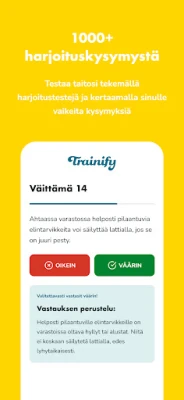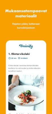 Aloita matkasi kohti ammatillisia pätevyyksiä uudella, älykkäällä tavalla Trainify-sovelluksen avulla. Trainify tarjoaa joustavan ja asiantuntevasti laaditun oppimisympäristön kaikille, jotka tähtäävät hygieniapassin, anniskelupassin tai työturvallisuuskortin suorittamiseen. Olemme mullistaneet tapaa opiskella työelämän vaatimia taitoja, tehden monimutkaisista säädöksistä ja käytännöistä helposti lähestyttäviä ja mukaansatempaavia. Unohda perinteiset kurssit ja sukella moderniin oppimiskokemukseen, joka mukautuu täysin sinun aikatauluusi ja oppimistyyliisi.